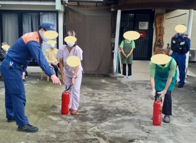 令和7年9月中旬、デイホーム大地にて避難訓練をしました。桐生消防署の方が、お見えになりました。消火器の使い方を説明していただきました。利用者様、職員、消火器を使いました。火の元に気を付けたいと思います。