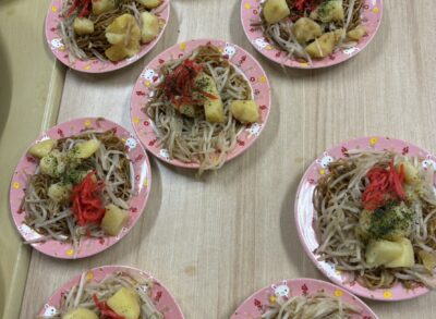令和7年8月下旬、デイホーム大地でおやつに焼きそば作りました。上手にできていますね!盛り付けもきれいですね! 皆様、美味しく召し上がっていました✨