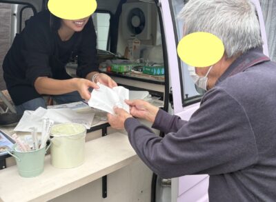 令和7年10月、デイホーム大地にキッチンカーが来ました。韓国のおやつ、ホットクのキッチンカーです。色々種類があって悩みますね。皆様、美味しく召し上がっていました✨