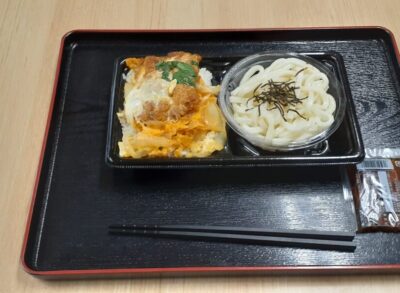 令和7年8月、外食弁当の日です。かつ丼、うどんのセットです。皆様、美味しく召し上がっていました✨
