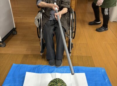 令和7年8月2日、スイカ割りをしました。狙って・・・皆様、楽しんでいました🎵皆様、美味しくいただきました✨